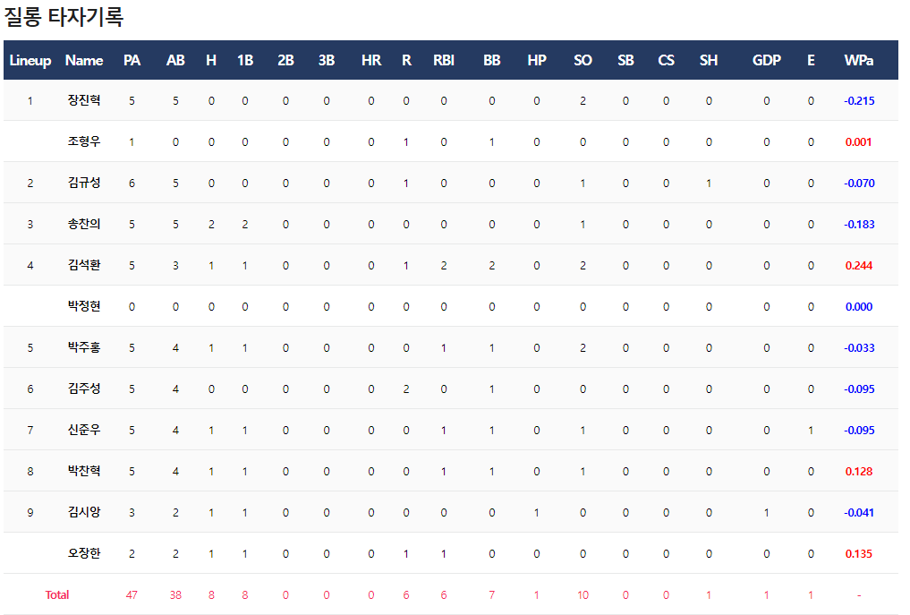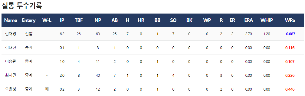 김재영 원정: 12.2이닝 13피안타 2볼넷 2자책점 ERA 1.42