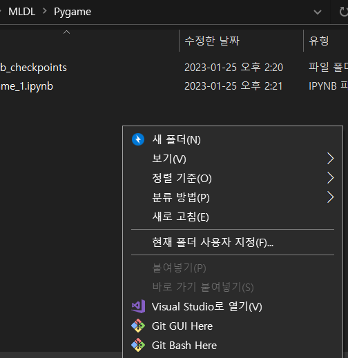 그 후 해당 폴더에 들어가 Git Bash Here을 클릭하면 해당 폴더 위치에서 Git이 실행된다.