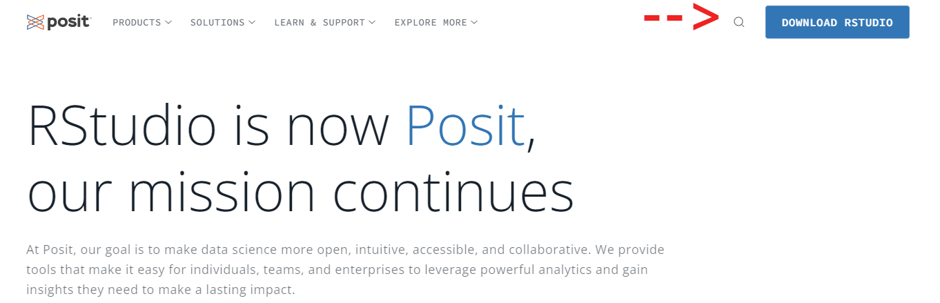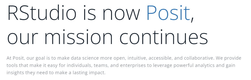 Rstudio는 Posit이라는 이름으로 바뀌었다. 홈페이지에 접속하면 이런 문구가 떠 있다.