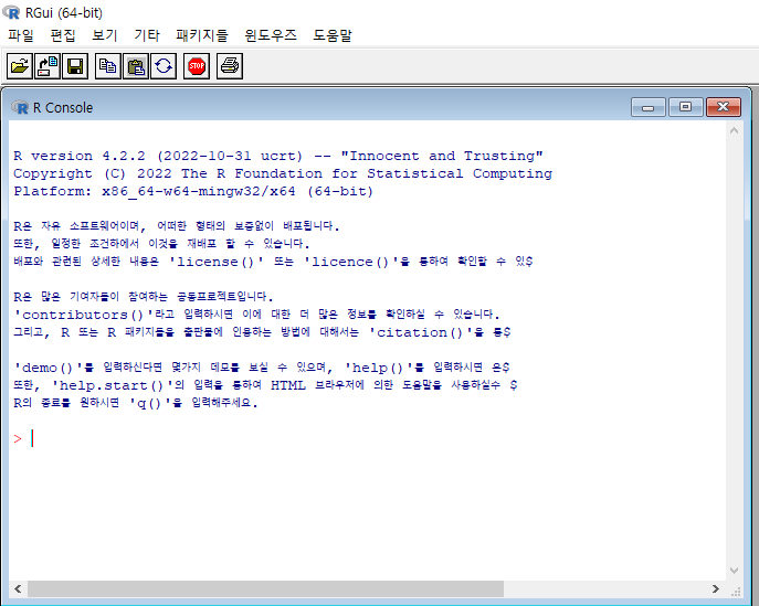 이후로 특별히 건드릴 것 없이 진행하면 설치가 완료된다. 설치 후 R을 켜보면,