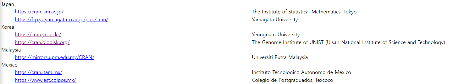 CRAN은 the Comprehensive R Archive Network의 약자로, R과 관련되어 업데이트된 자료 및패키지를 보관하고 있다.