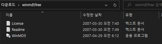 이 중 winMD5.exe 파일을 실행하면 바로 md5sum 검사를 할 수 있다.