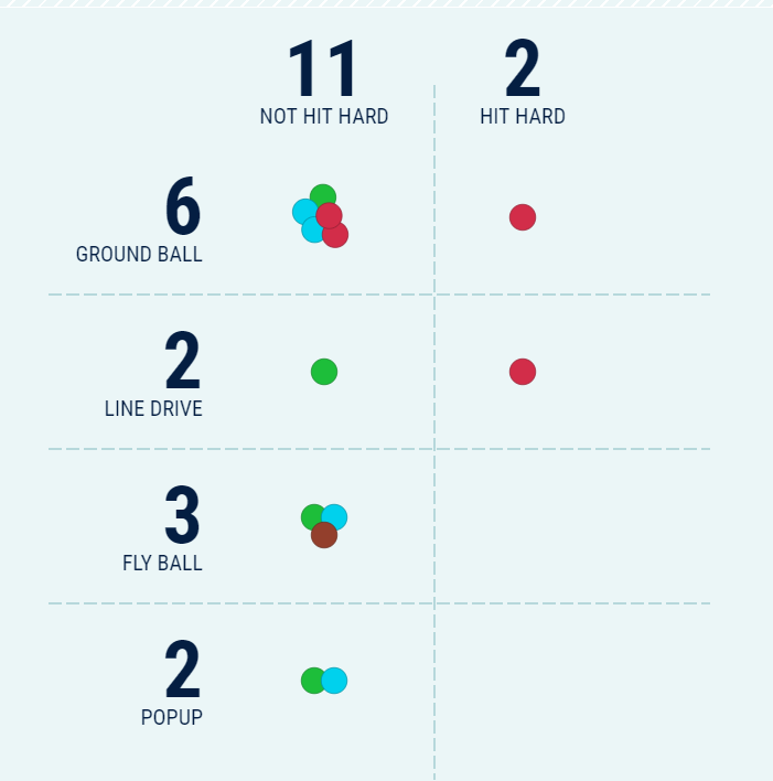 오늘 류현진이 허용한 인플레이 타구 중 하드히트는 단 2개에 불과했다. 시즌 1승을 거둘 때와 같이, 강한 타구의 비율을 억제할 수 있었기 때문에 오늘도 좋은 성적을 거둘 수 있었다.