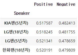 물론 kcBERT 모델이 야구의 특성을 고려한 대화흐름을 완벽히 파악하지는 못 했을 것이다. 하지만 모두가 큰 차이 없는 결과를 보니, 응원하는 팀과는 관계없이 '야구팬들은 다 똑같구나' 하는 생각도 든다.
