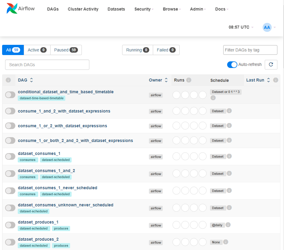 위와 같은 화면이 노출된다. 아래의 리스트는 샘플로 만들어놓은 DAG리스트다. 리스트 중 하나의 샘플을 선택해보자.