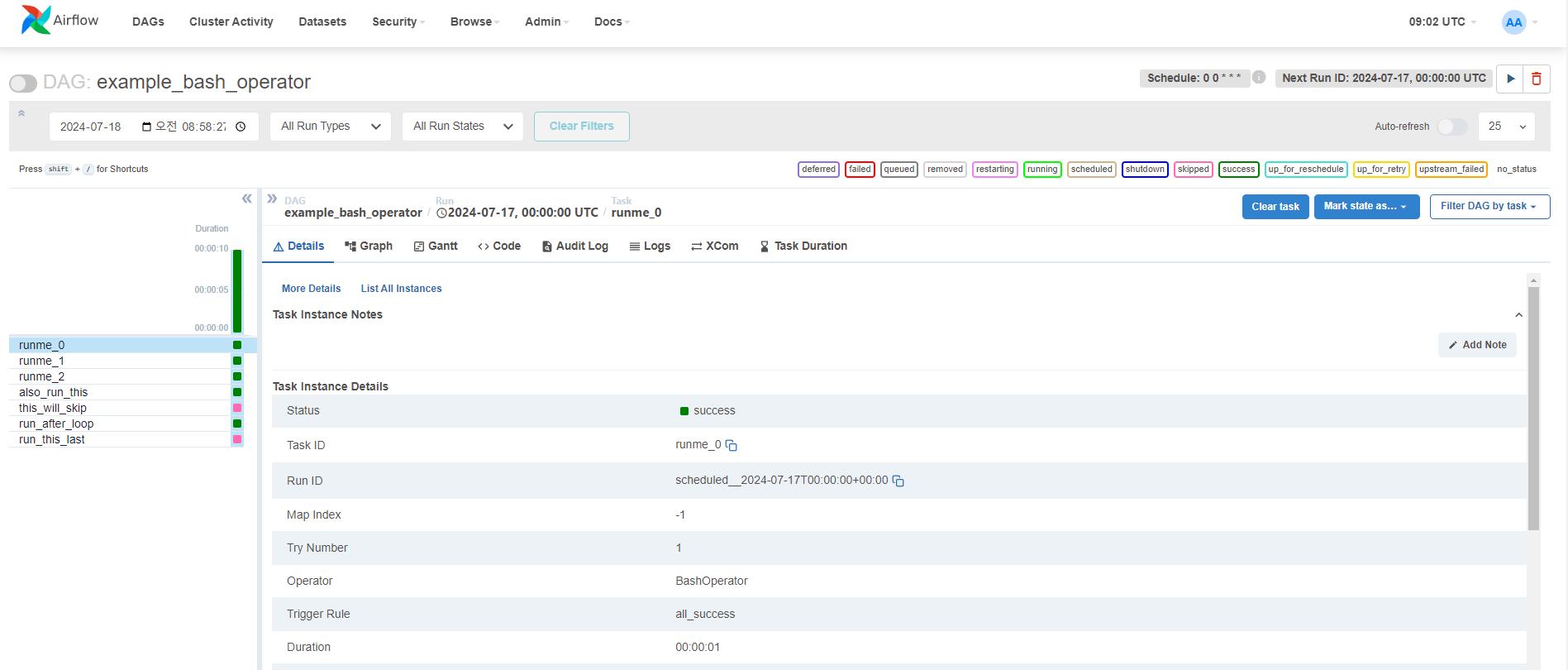 선택하여 접속하면 해당 DAG에 대한 자세한 정보를 알 수 있다. 해당 페이지에 관해서는 추후 실습을 통해 더 자세히 기록하도록 하겠다.
