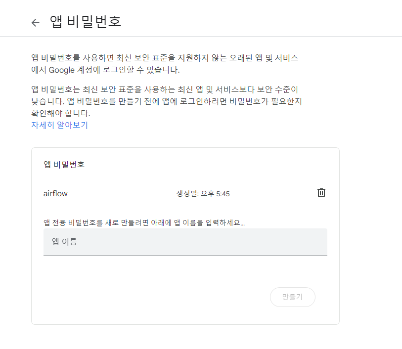 구글 계정관리 > 보안 > 2단계 인증 > 앱 비밀번호 세팅