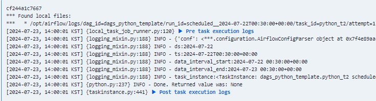 - 파이썬 오퍼레이터는 **kwargs에 template 변수를 자동으로 제공해준다. 딕셔너리 key값을 이용해 템플릿 값들을 사용할 수 있다.