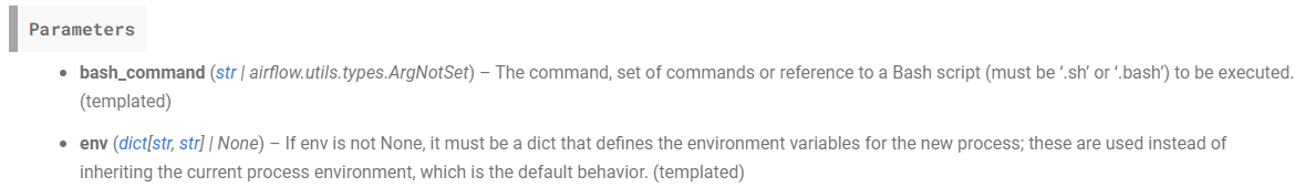 Airflow 공식 문서 내 Operators 부분에서 Parameters 각 줄 뒤에 (templated)와 같은 스트링이 붙어있어야 템플릿을 활용할 수 있다. 그 외에는 활용할 수 없다.