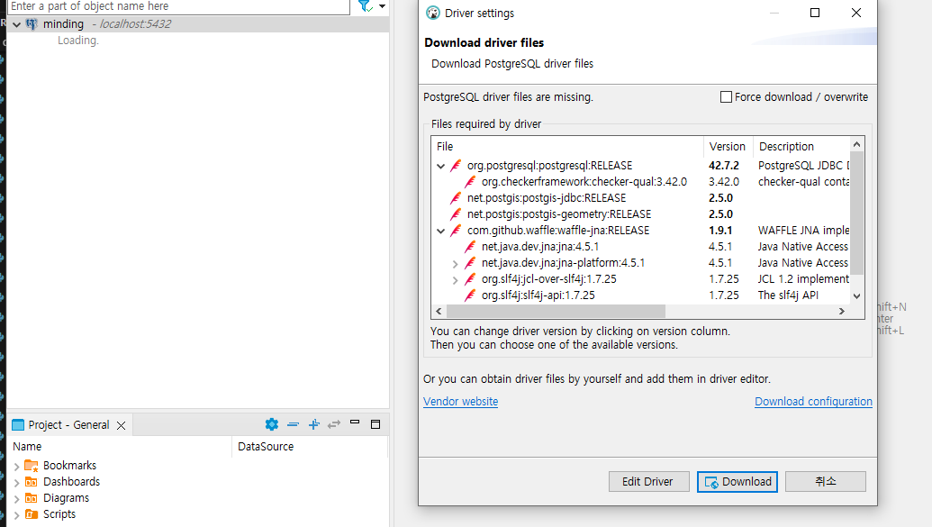 이후 왼쪽의 DB를 눌러 드라이버를 다운로드 받아준다.(최초 접속시에만)