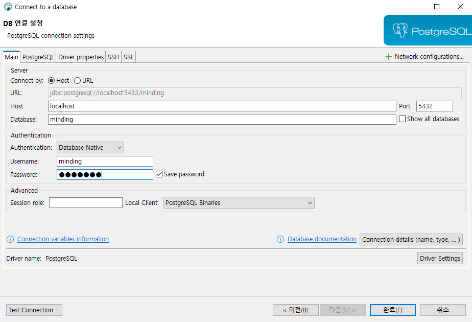 Host는 기본적으로 WSL과 연동되어 있는 localhost를, 포트 번호는 위에서 설정한 5432 포트를 사용한다.