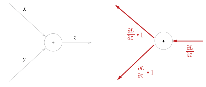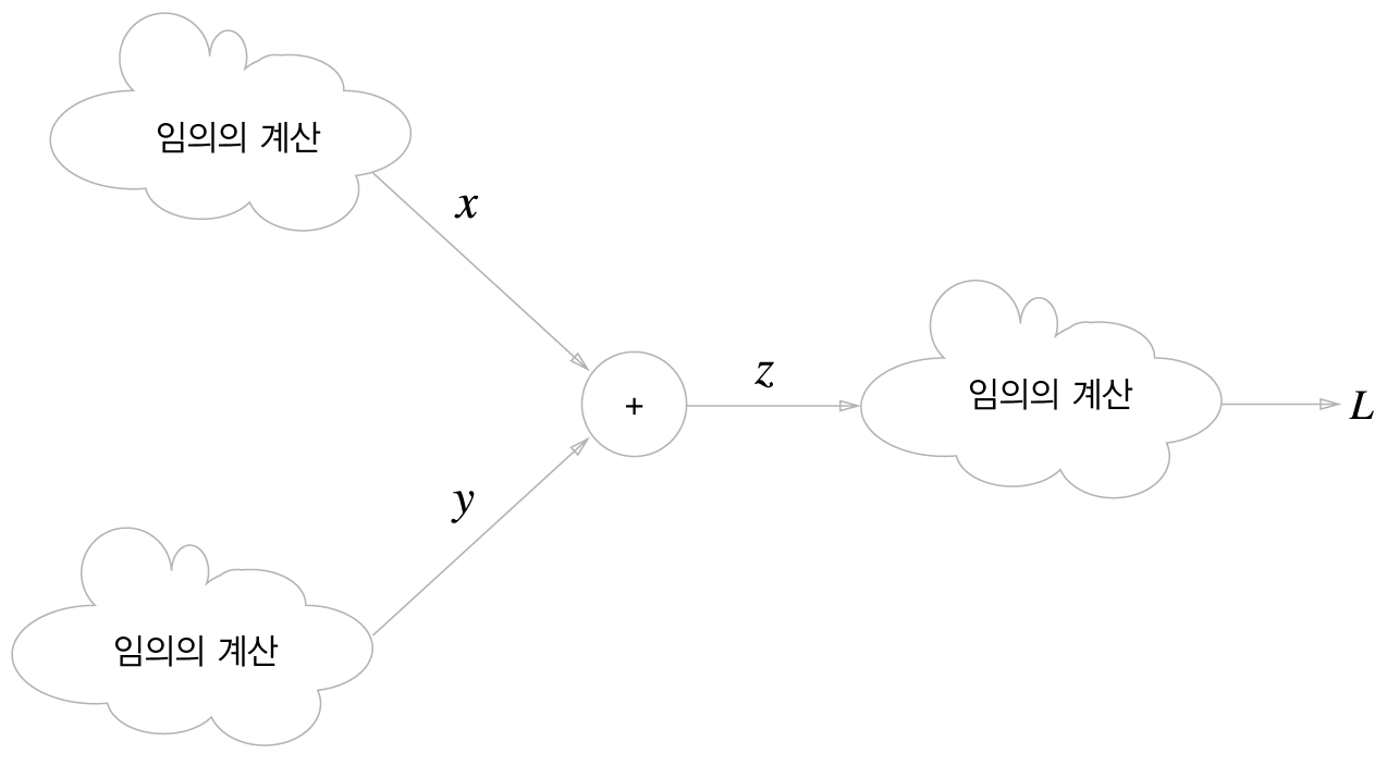 - 위의 z = x + y 계산은 큰 계산 그래프의 중간 어딘가에 존재한다고 가정했기 때문에, 이 계산 그래프 상류에서부터 aL/az가 전해졌다고 가정