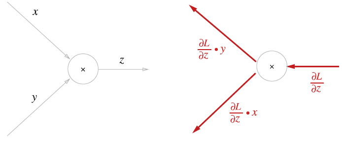 - 곱셈노드 역전파는 상류의 값에 입력 신호들을 서로 바꾼 값을 곱해서 하류로 보냄