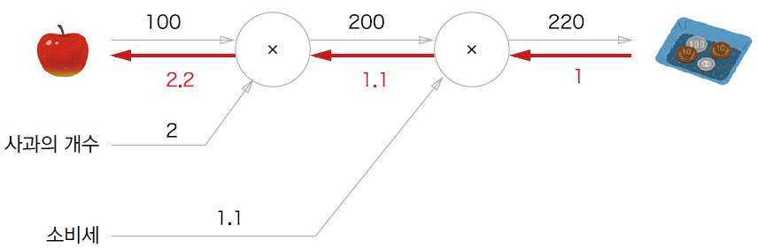 - 사과가격 미분 2.2 / 사과 개수 미분 110 / 소비세 미분 200 만큼 최종금액에 영향
