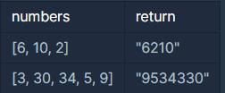 0 또는 양의 정수가 담긴 배열 numbers가 매개변수로 주어질 때, 순서를 재배치하여 만들 수 있는 가장 큰 수를 문자열로 바꾸어 return 하도록 solution 함수를 작성해주세요.