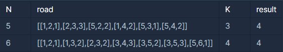 마을의 개수 N, 각 마을을 연결하는 도로의 정보 road, 음식 배달이 가능한 시간 K가 매개변수로 주어질 때, 음식 주문을 받을 수 있는 마을의 개수를 return 하도록 solution 함수를 완성해주세요.