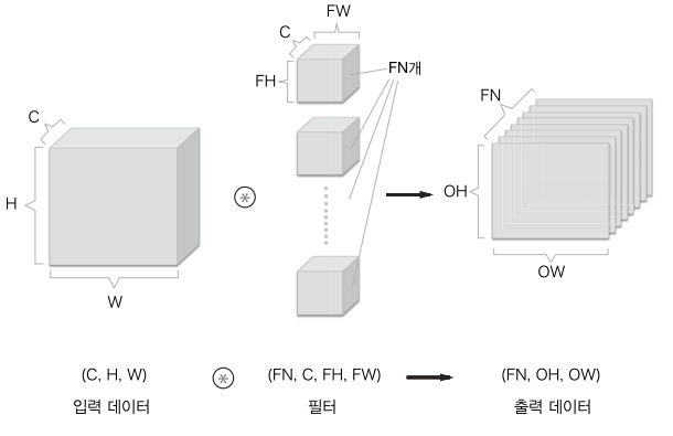 - 합성곱 연산에서는 필터의 수도 고려해야 함