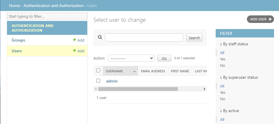 이 중 Users 메뉴에 들어가면, 이전에 추가한 admin 계정이 노출되는 것을 확인할 수 있다. 오른쪽 상단에 ADD USER 버튼을 통해 새로운 계정을 생성할 수 있다.