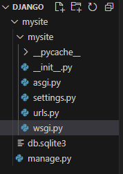 코드 입력 후 mysite라는 폴더가 하나 생성된 것을 알 수 있다. 그 안에 진입하면 여러가지 파이썬 파일이 생성된 것을 알 수 있다. 이들은 django 명령어를 터미널에서 쓸 수 있도록 도와주는 파일들이다.