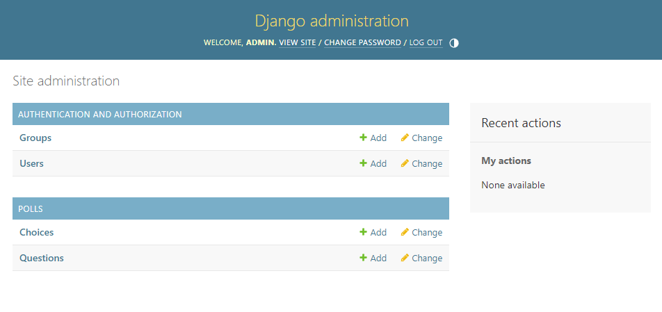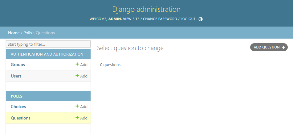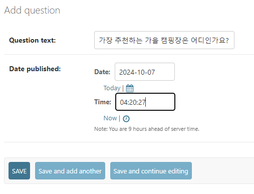 위와 같이 Question과 Choice가 등록된 것을 알 수 있다. Question에 새로운 레코드를 생성해보자. Questions를 눌러 세부 페이지에 진입해봤다.