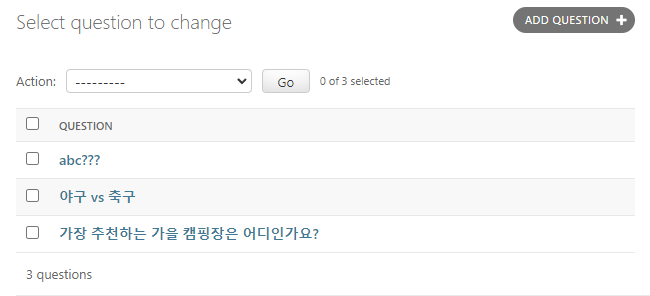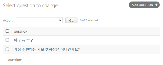 Admin을 열어 Question 모델을 확인해보니 '야구 vs 축구'라고 적힌 레코드가 하나 추가된 것을 알 수 있다.