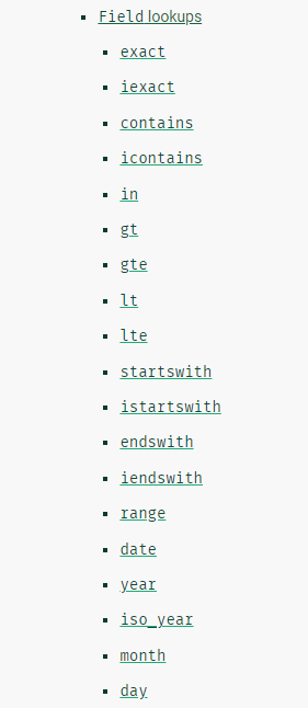 위의 예시에서 필터링을 이용해 조회한 것 이외에도 여러가지 조건을 선택할 수 있다. 장고 공식 문서를 참고하면, 여러가지 조건을 걸 수 있다는 것을 알 수 있다. (공식문서 링크)