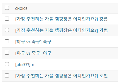 <QuerySet [<Choice: [가장 추천하는 가을 캠핑장은 어디인가요?] 포천>, <Choice: [가장