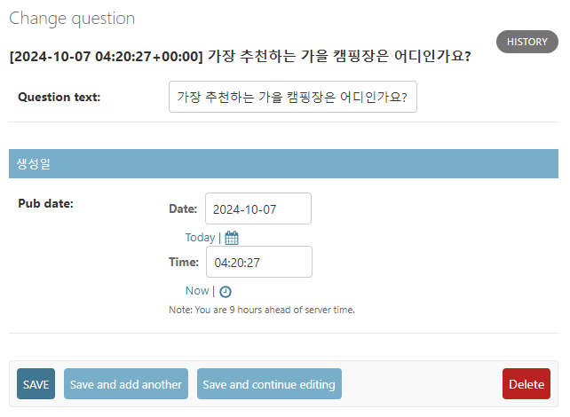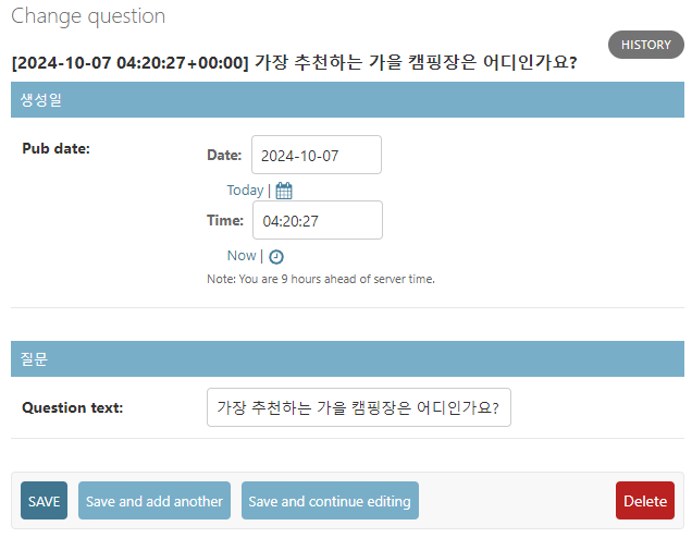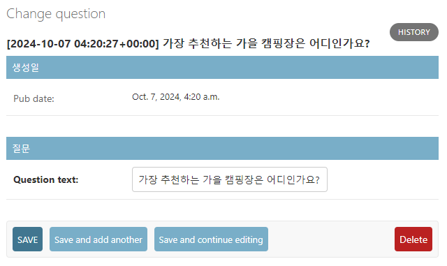 위 화면에서 Question text와 Pub date간의 가장 큰 차이는 무엇일까? '생성일'이라고 표시되는 일종의 구분선의 유무이다. 앞서 admin.py에서 fieldsets에 전달해줄 때, Question text에는 None으로 전달했기 때문에 구분선이 노출되지 않는 것이다. 이를 흔히 섹션 구분이라고 한다.