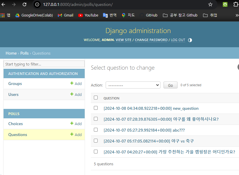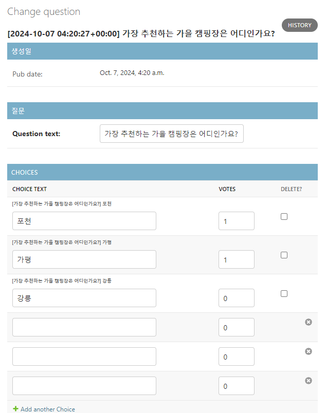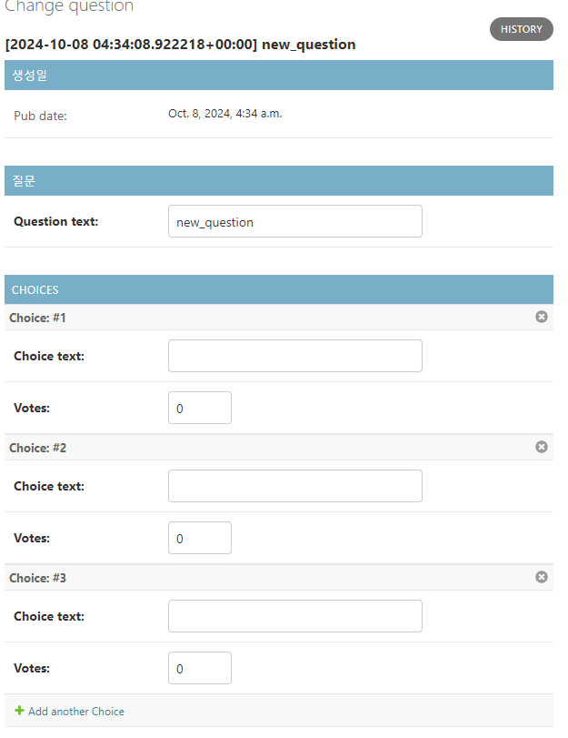 아직 연결된 답변이 없는 질문에도 3개의 빈칸이 주어진다. 이는 위 코드의 ChoiceInline 클래스에 extra로 전달했던 인자가 3이었기 때문에, 기본 값으로 3개의 빈칸이 주어진다. (모든 질문에서 동일)