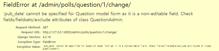 위와 같이 에러 페이지가 나타나게 된다. 에러 메시지를 읽어보면 pub_date가 수정(편집)을 허용하지 않는 필드라고 하는데, models.py에서 pub_date에 대해 살펴보면, auto_now_add=True로 되어 있어 해당 에러가 발생하는 것 같다. auto_now_add를 지워주자.