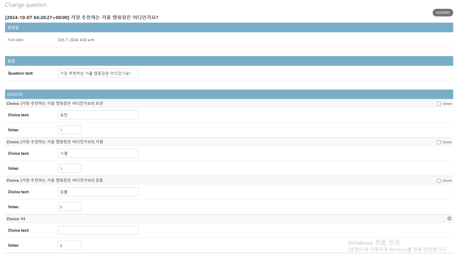 그리고 models.py에서 pub_date에 대해 auto_now_add를 True로 다시 설정해준 뒤, 새로고침한다면