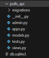mysite 폴더 내부를 살펴보면 아래와 같이 polls_api 폴더가 새로 생성된 것을 알 수 있다. 이제 본격적으로 시리얼라이저를 구현해보자.