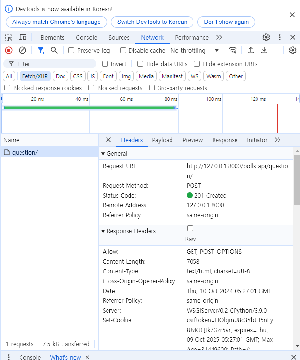 위와 같이 개발자 도구에서 관련 내용을 확인할 수 있다. Request method는 POST이며, 201 코드가 반환된 것을 보니 성공적으로 반영된 것으로 보인다.