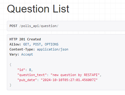 따로 구현하지 않은 웹 페이지이지만, 이전에 만들었던 질문들의 리스트가 보여지고 있다. REST API 형태로 GET 요청을 보냈을 때, 위와 같은 응답이 나타난다는 걸 알 수 있다.