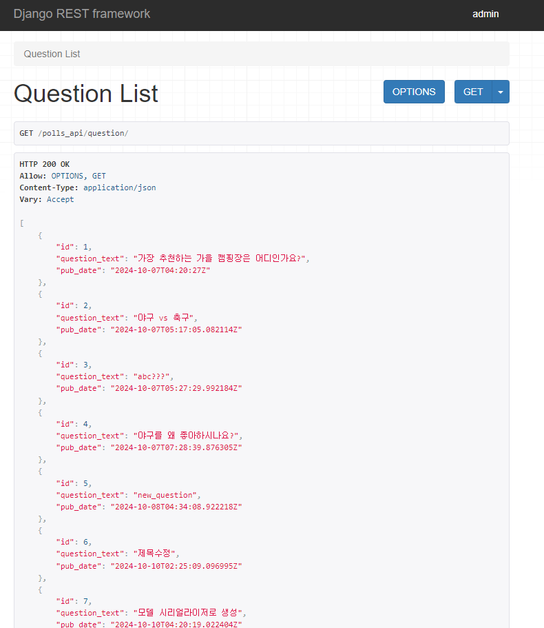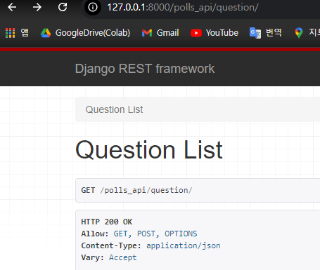 그 다음 서버를 실행해 해당 URL('/polls_api/question')에 접속해보자.