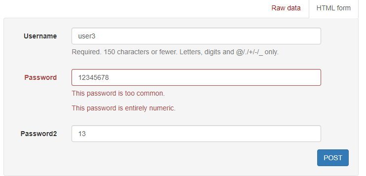 또한 시리얼라이저를 이용해 유저를 생성할 경우, Password에 아무런 규칙이 없어 아주 간단한 비밀번호도 설정할 수 있다.(ex. 12345678) 위에서 실습한 Form의 경우 기본적으로 설정된 규칙이 있었지만, 이 방법을 이용할 경우 보안 문제가 발생할 우려가 있다.