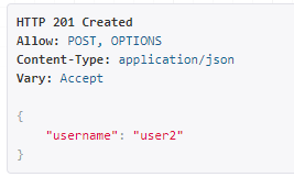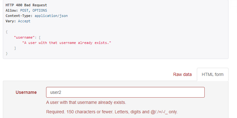 400 에러코드가 반환되며 이미 해당 username을 사용하는 유저가 있다고 한다. 이는 User 모델 자체에서 username이 중복되는 User가 생성되지 못하도록 설정해 놓았기 때문이다.