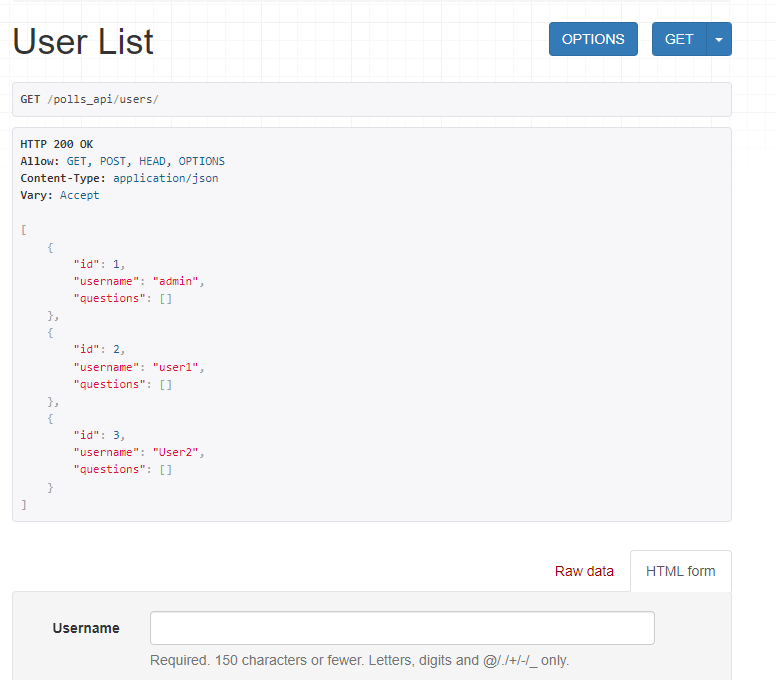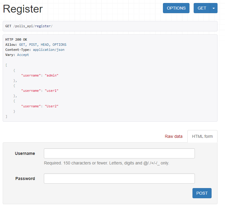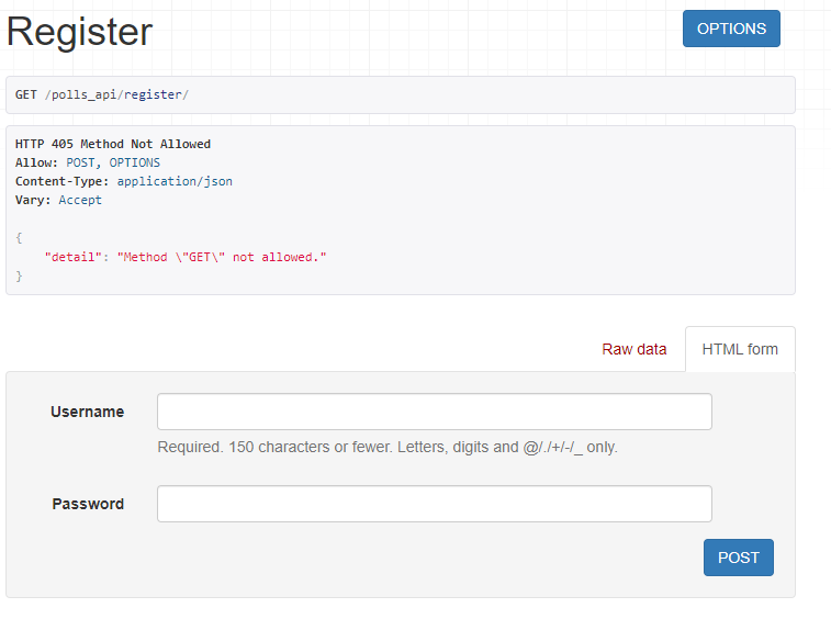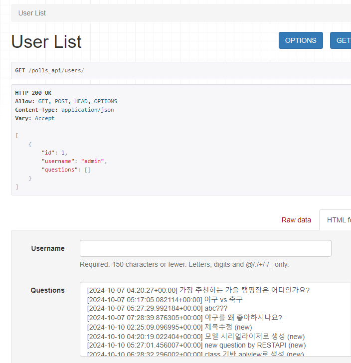 등록화면이 정상적으로 노출되는 것을 알 수 있다. User list가 노출되는 부분에 "Method \"GET\" not allowed"라는 메시지가 출력되는데, 이는 위에서 view를 CreateAPIView로 구성했기 때문이다. GET까지 사용하려면 ListCreateAPIView를 사용하면 된다.