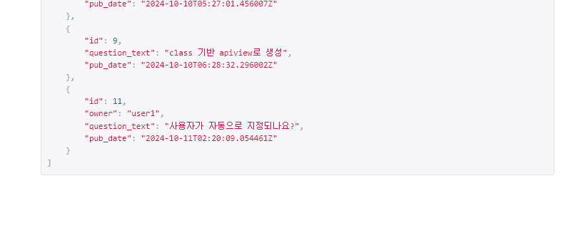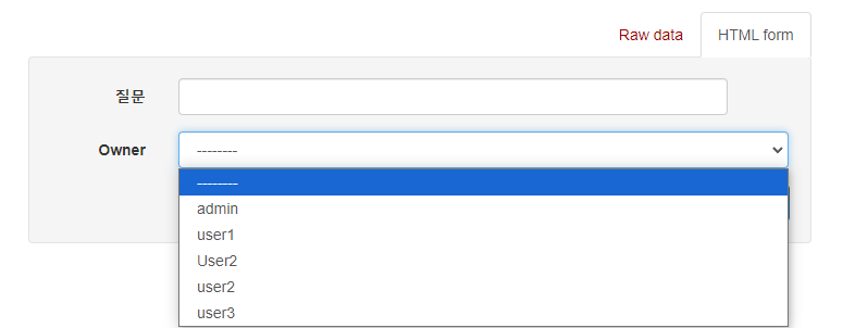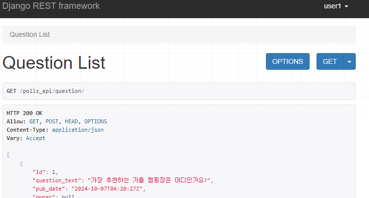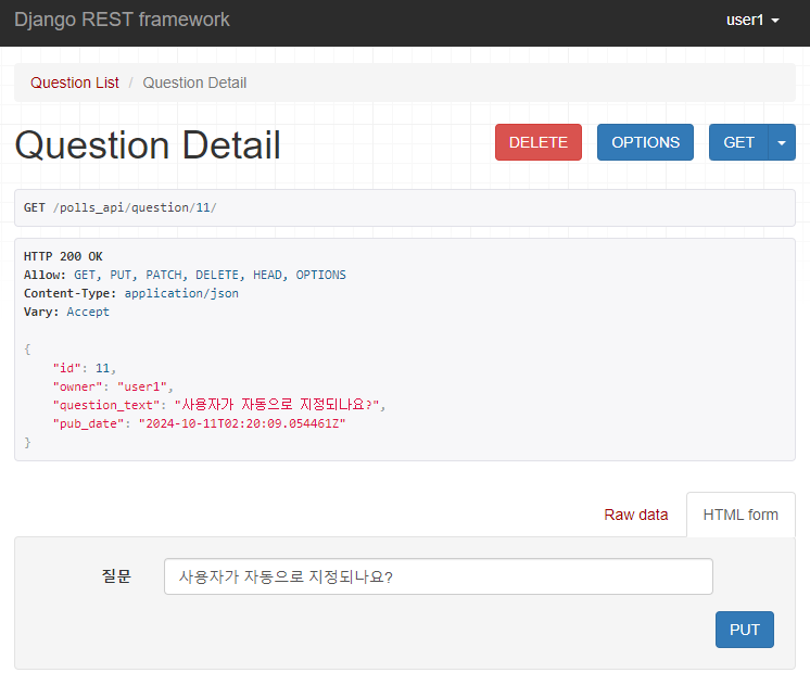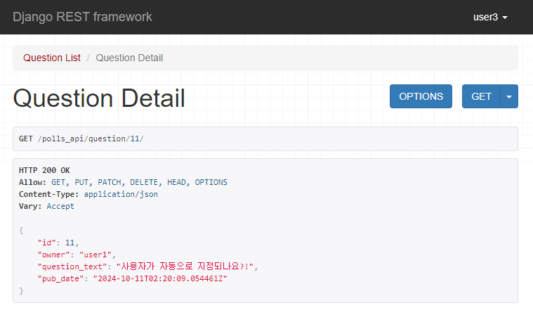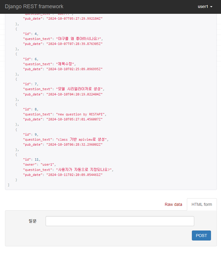 이제 POST 요청을 통해 질문을 생성하게 되면, 현재 로그인된 계정인 user1이 자동으로 owner로 지정되는 것을 알 수 있다.