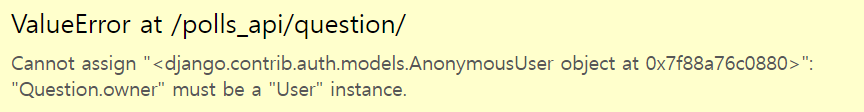 위와 같은 에러가 발생하게 된다. Question.owner 필드는 User 인스턴스가 필요하다고 한다.