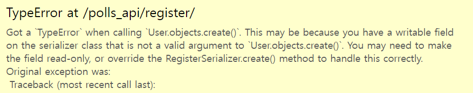 위와 같은 에러가 발생한다. 이는 User 모델에는 username과 password 필드만 존재할 뿐, 위의 경우 password2 필드까지 포함되어 전송하고 있기 때문이다. 이 경우에는 create 메서드를 직접 구현해주어야 한다.
