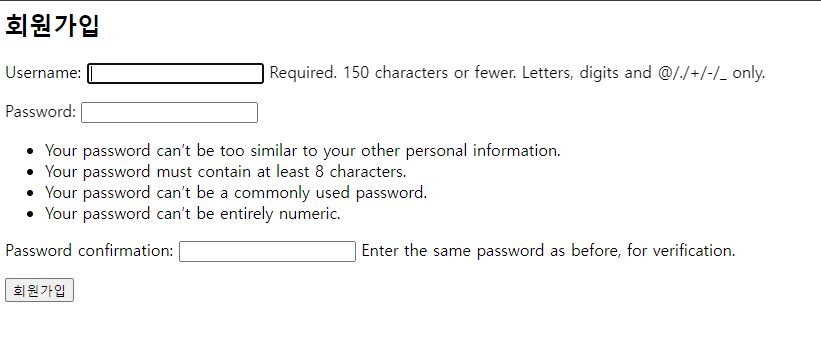 Django에서 기본으로 제공하는 회원가입 폼과 generic의 CreateView를 상속받는다. 입력된 정보는 polls_api의 user_list로 전달되어 POST된다. 템플릿으로는 signup.html을 사용하는데, 아래와 같이 구현한다.