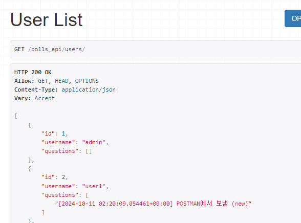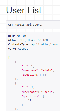 현재 User List를 살펴보면, 각 유저의 question 필드에 질문 레코드의 id값이 표시되는 것을 확인할 수 있다. 이것은 serializers.py에서 UserSerializer를 설정할 때 PrimaryKeyRelatedField를 사용했기 때문이다.