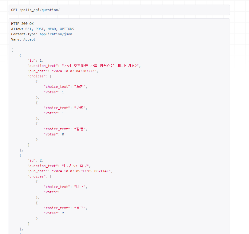 위와 같이 해당 질문 레코드에 관계된 답변(choices)이 모두 출력되는 것을 볼 수 있다.