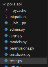 polls_api 폴더로 이동해보자. 생성한 앱에는 자동으로 test.py 파일이 존재하는 것을 볼 수 있다.