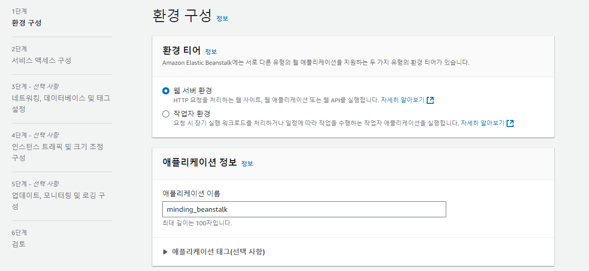 Elastic Beanstalk > 애플리케이션 생성 으로 진입한다. 1단계 화면에서는 환경 티어, 정보, 플랫폼(언어) 등을 설정할 수 있고, 실습 환경의 경우 대부분을 기본값으로 진행하면 된다.