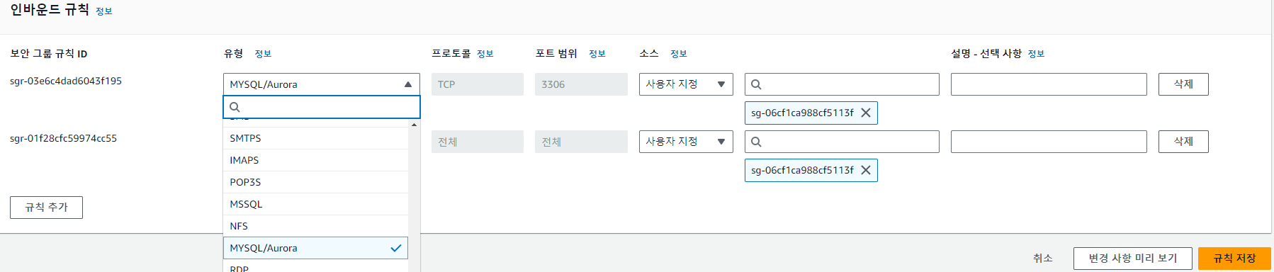 위처럼 MYSQL/Aurora, TCP, 3306에 해당하는 규칙이 없다면 우측 상단 '인바운드 규칙 편집'을 눌러 규칙을 추가해야 한다.