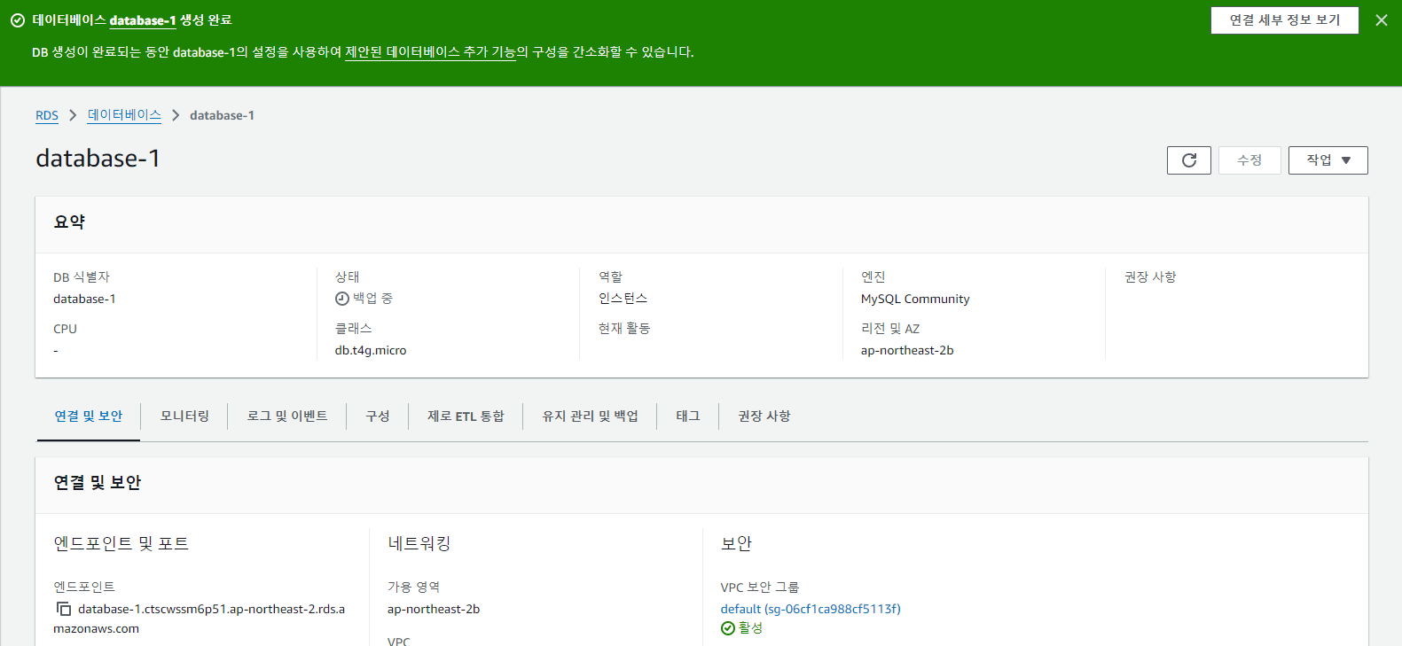 생성이 완료되었다면 좌측하단에 엔드포인트 주소가 노출될 것이다. 이 주소를 통해 DB에 접속할 수 있다.