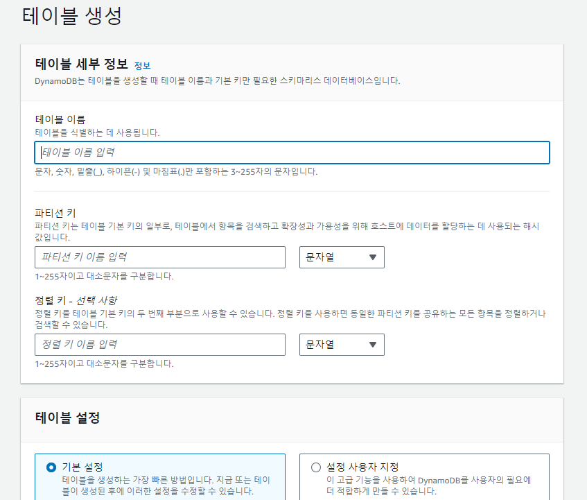 테이블 생성은 매우 간단하다. 파티션 키와 정렬 키 등을 입력해 설정한다.