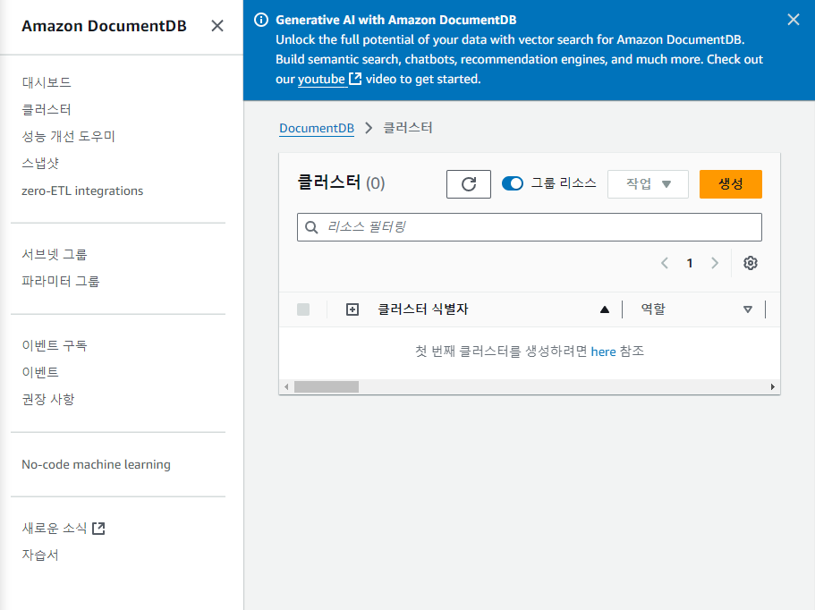 AWS에서 DocumentDB를 만드는 법은 간단하다. 클러스터를 생성한 뒤, 그 안에 데이터베이스를 생성하는 방식이다. 하지만 여기서 RDB와 다른 점이 존재한다.